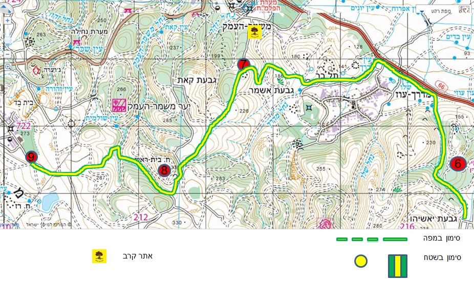 לאחר הפסקה ושמיעת הסבר נמשיך לנוע עם השביל שיורד כעת מהאנדרטה ומתלכד עם שביל בסימון אדום לכיוון דרום מערב. על הגבעה המצויה צפונית מערבית לשביל במקום זה ממוקמת אנדרטת הקיבוצים שהוקמה על ידי התנועה הקיבוצית וקק"ל לזכר הנופלים במערכות ישראל נופלי הקרבות באזור.אנו ממשיכים לטפס במתינות בלב אזור גבעות בנוף מרתק. אנו עולים עלייה מתונה יחסית ומגיעים לקטע בו מתמזג השביל שלנו עם שביל לאופניים. זהו חלק מסיגנל "עיט", אחד ממסלולי רכיבת האופניים הרבים המצויים באזור. כעת אנו נעים ממזרח ובצמוד לגבעה עליה קיימים שרידי חירבת בית-ראש (8). הגבעה, ברום של למעלה מ 300 מטר מעל פני הים היא אתר עתיקות שיש אליה גישה בדרך יער מכיוון משמר העמק. מהחרבה רואים נוף מרהיב של עמק יזרעאל, רמות מנשה , הגליל התחתון והכרמל. במידה ויש זמן, מומלץ לעלות לחירבה בטרם נמשיך עם השביל. במקום הנקרא גם חרבת בית ראס, נתגלו שרידי ישוב קדום שהחל עוד בתקופת הברזל, והתקיים גם בתקופות הפרסית, הרומית והביזנטית שבאו לאחר מכן. במלחמת השחרור היה במקום מוצב של הפלמ"ח בעת הקרבות כנגד "צבא ההצלה" של קאוקג'י והעתיקות התגלו בזמן חפירת התעלות והקמת הביצורים. בין הממצאים המעניינים שנמצאו במקום – חרפושית מצרית מימי החיקסוס, מטבע מזמן המרד הראשון ומתקנים חקלאיים מהתקופה הביזנטית. מערות קבורה לרוב מפוזרות במרחב הגבעה. מדרום מערב לגבעה ולרגליה (לא במסלול שלנו) נובע עין שלמית- מעין ששימש את הישוב העתיק ואת קיבוץ עין השופט בראשית דרכו, יותר מאוחר הופנו מי המעין למשמר העמק באמצעות צינור. הבריכה שליד המעין מהווה בית גידול למינים ממשפחת הדו-חיים. השביל מקיף את גבעת חרבת בית ראש מדרום ופונה לצפון מערב. הוא עדיין מתלכד עם השביל בסימון אדום אך לאחר כקילומטר מגיע קטע שבו הוא מתלכד במקביל עם שביל אזורי רמות מנשה. לאחר זמן קצר כיוון השביל שלנו משתנה למערב ועד סוף המקטע (קצת פחות מ 2 ק"מ) הוא מתלכד עם שביל רמת מנשה. השטח הקרוב נעשה שוב פתוח ואנו מסיימים את המקטע בהליכה בין משמר העמק  ועין השופט מצפון, לבין אזור אלכפרין מדרום, שהיה עד מלחמת ששת הימים שטח אימונים באש של קורס מכי"ם של חטיבת גולני שישב עד אז בג'וערה. חניכי קורסי המכ"ים של גולני מעולם לא נסעו מהבסיס בג'וערה לשטח האימונים ברכב אלא הלכו ברגל , לכל כיוון כ 4 ק"מ ויותר וחצו מן הסתם את תוואי השביל שלנו הממשיך עד כביש הגישה לעין השופט מדרום (9). במקום בו השביל נפגש עם הכביש הממשיך לכיוון הקיבוץ.