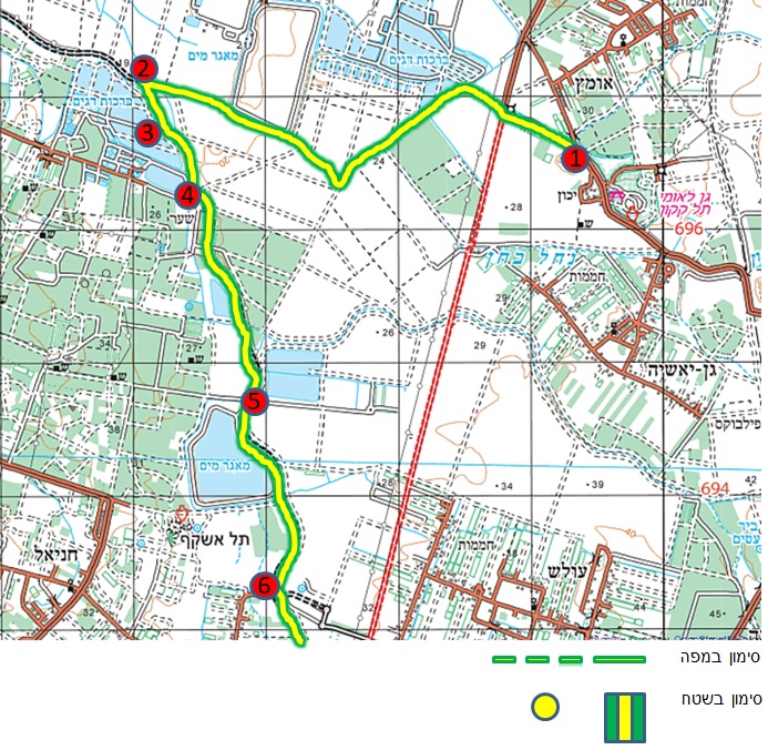 נתחיל לצעוד מהכניסה למושב אומץ (1) במקביל לכביש עם השביל לכיוון צפון מערב. נעבור בדרך ליד מבנה שאיבה ולאחר כ 600 מטר הכביש הסלול יסתיים במפגש עם שביל בסימון אדום המגיע מדרום ואנו נמשיך בשביל לכיוון ברכות דגים. לאחר כ 300 מטר נוספים השביל פונה לכיוון דרום מערב כשהוא מסומן בסמוך לברכה. הצעידה כעת היא בשטח פתוח באווירה פסטורלית. כקילומטר וחצי לאחר הפנייה דרומה, יפנה השביל לכיוון צפון מערב לכמה מאות מטרים ושוב ישנה כיוון לדרום מערב עד הגיעו לשפת ברכת דגים בה הוא משתלב עם שביל בסימון שחור ופונה לכיוון דרום מזרח (2). מכאן, נמשיך לצד מטעים וברכות דגים. מעט אחרי הפנייה נזהה בוסתן תאנים (3) וזה מקום טוב לעצור בו למנוחה.